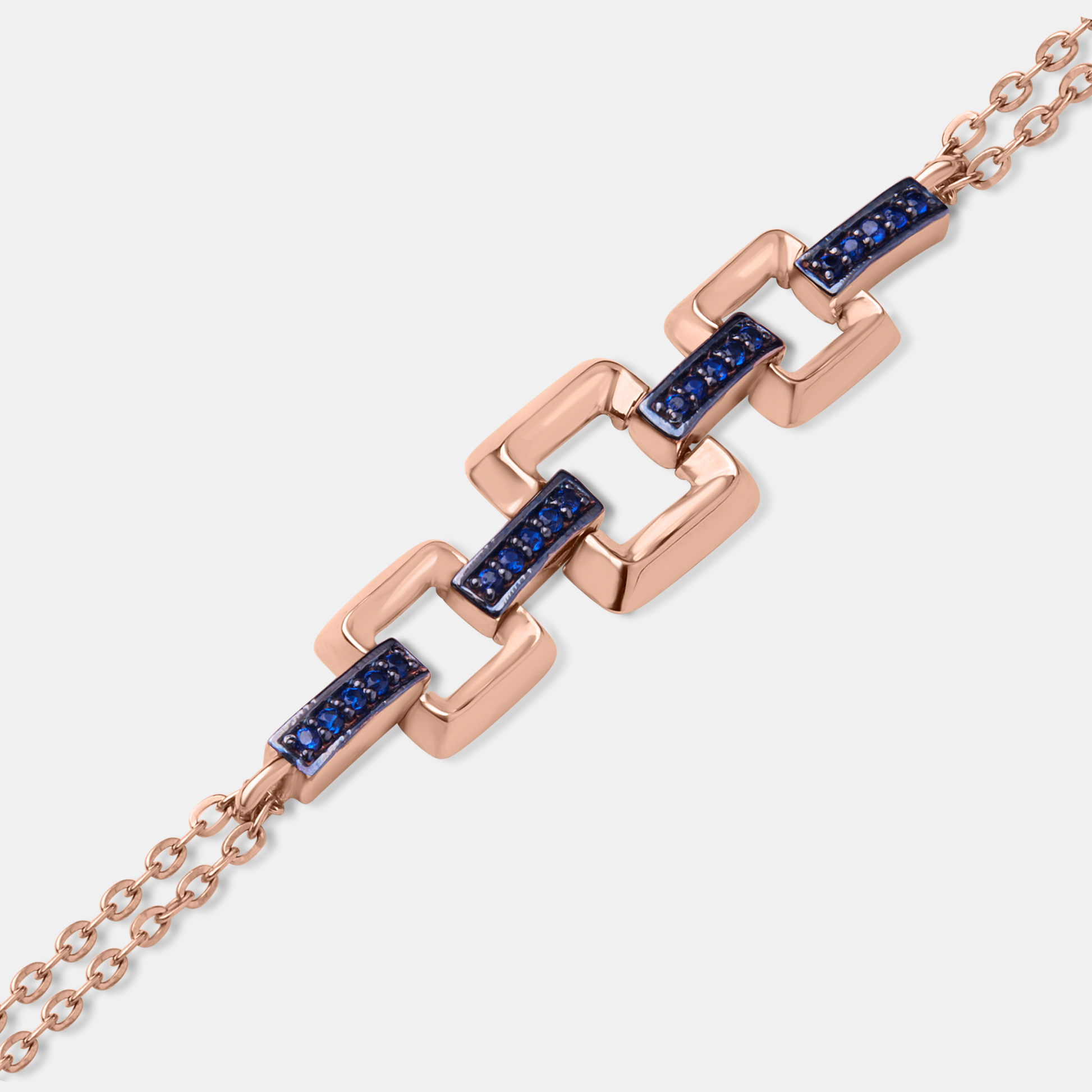 This contemporary rose gold bracelet features striking rectangular links, each meticulously adorned with vibrant blue stones, creating a bold yet elegant statement.